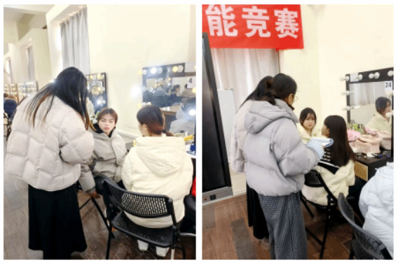 比赛现场,选手们屏气凝神、手法娴熟。底妆细腻服帖,眼妆层次分明,唇妆精准勾勒,每一个步骤都彰显着扎实的专业功底。创意环节中,学子们各展所长,有的将新中式清雅韵味融入妆造,以淡粉眼影搭配简约头饰,尽显温婉端庄;有的大胆运用色彩碰撞,用精致配饰点缀整体造型,打造出时尚灵动的风格。90 分钟内,选手们完成从妆容设计到整体造型搭配的全流程创作,模特们在巧手装扮下焕然一新,展现出多样的美学表达。