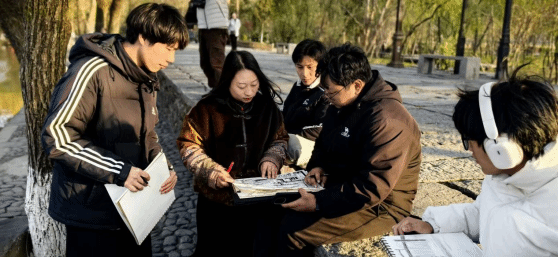 每日的作业批改环节成为研学的“二次课堂”。两位带队教师结合当日写生场景逐一点评:对构图失衡的作品,标注“可借鉴南湖‘左右对称、主次分明’的布局调整”;对色彩偏差的画稿,提示“参考查济白墙‘晨暖暮冷’的自然色调规律”。同学们拿着批改意见再赴实景比对,创作中的不足随之快速修正,专业技艺在理论与实践的联动中稳步提升。